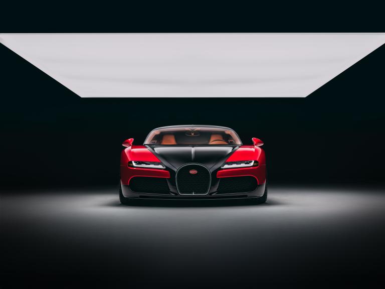 La livrée illustre elle aussi l'évolution du savoir-faire Bugatti. Le rouge profond de la carrosserie résulte d'un procédé complexe associant une base aluminium argentée à un vernis teinté, créant un effet de profondeur saisissant selon l'angle de la lumière. La fibre de carbone apparente, volontairement laissée visible, apporte un contraste subtil et met en valeur la texture du matériau, loin d'un simple noir uniforme.
