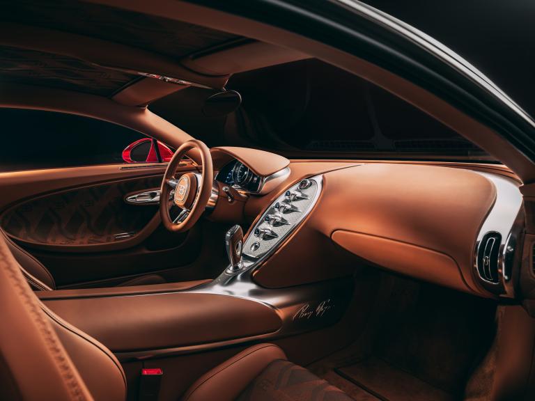 L'habitacle marque une rupture plus franche encore avec les productions récentes de la marque. Inspiré directement de la Veyron originelle, il adopte un volant circulaire au dessin épuré et une console centrale entièrement usinée dans la masse. Les matériaux font appel aux savoir-faire les plus pointus, avec des tissus "Custom Car Couture" développés à Paris, soulignant l'orientation résolument artisanale du projet. L'ensemble tranche avec les intérieurs plus technologiques de la Chiron ou de la Mistral, dans une approche volontairement intemporelle.