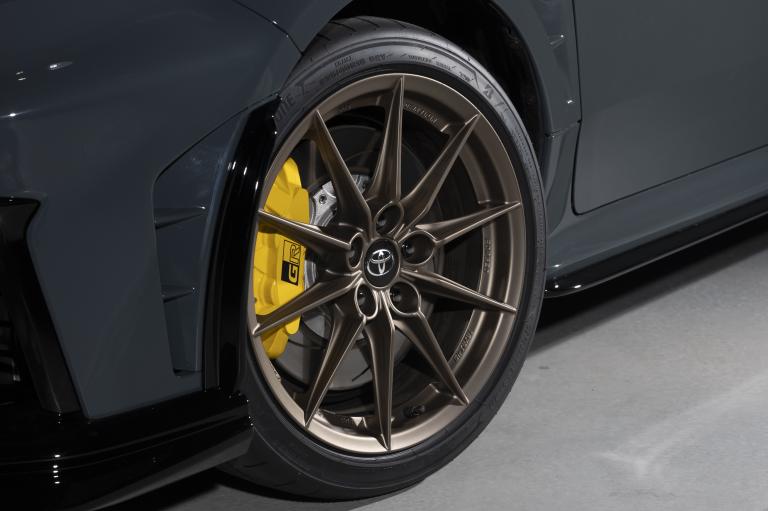 L'habitacle est conçu comme un poste de pilotage orienté sport automobile. Le volant gainé de suédine, au diamètre légèrement réduit, reçoit des palettes et commandes modifiées pour une utilisation en conduite engagée, avec une disposition inspirée de la GR Yaris Rally2. Les sièges spécifiques, les surpiqûres jaunes, les inserts intérieurs assortis et l'affichage TFT dédié au mode "MORIZO" soulignent la dimension fonctionnelle de l'ensemble. Chaque exemplaire est également doté d'une plaque numérotée exclusive.