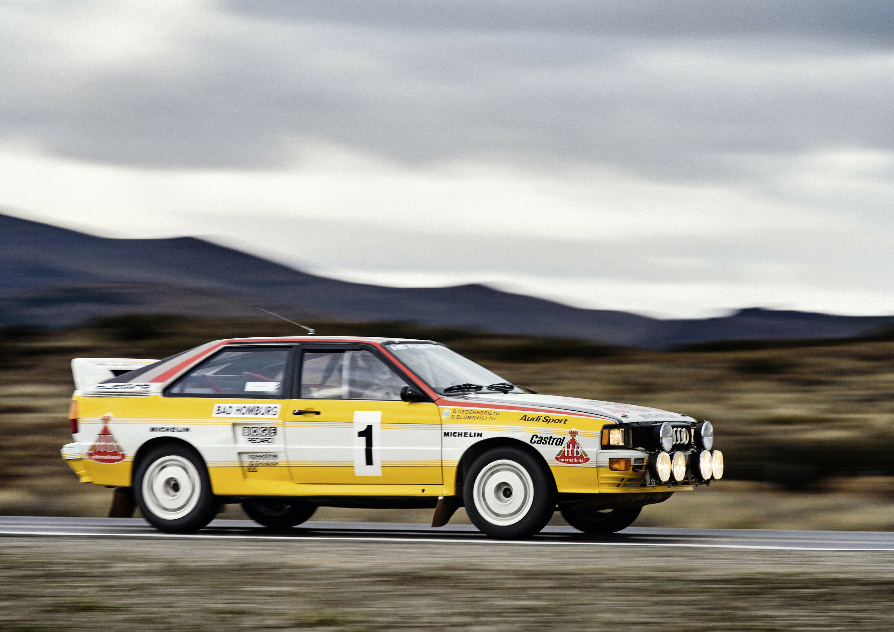 En 1980, l'Audi quattro de route est animée par un cinq cylindres turbo délivrant 147 kW (200 ch) à son lancement. En compétition, la même recette offre à Audi le titre constructeurs en Championnat du monde des rallyes en 1982 ; Hannu Mikkola sera sacré pilote l'année suivante. En 1983 arrive la Sport quattro, raccourcie de 24 cm, élargie et dotée d'un tout nouveau cinq cylindres en alliage léger à quatre soupapes par cylindre. Avec 225 kW (306 ch), elle devient alors l'auto la plus puissante jamais proposée par un constructeur allemand pour la route. La version Groupe B, forte d'environ 450 ch (331 kW) dès ses débuts, dispute son premier rallye en Côte d'Ivoire en 1984, tandis que Stig Blomqvist enlève le titre pilotes au volant d'une Audi quattro A2 de 265 kW (360 ch), offrant dans la foulée un nouveau titre constructeurs à la marque.