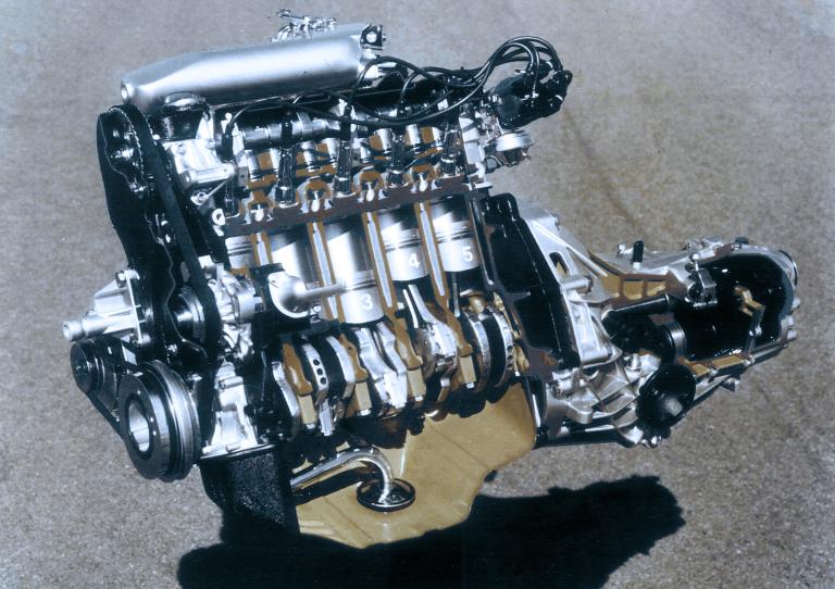 Au début des années 1970, les ingénieurs d'Ingolstadt cherchent à positionner l'Audi 100 (type 43) un cran au-dessus de sa devancière. Les quatre cylindres du moment n'offrent ni la souplesse ni les performances souhaitées, et le six cylindres en ligne est écarté pour des raisons d'encombrement et de répartition des masses. Audi se tourne alors vers une solution intermédiaire dérivée de la famille EA827, le quatre cylindres qui équipe déjà une bonne partie de la gamme. Le résultat est un cinq cylindres en ligne de 2 144 cm³ développant 100 kW (136 ch), alimenté par injection pour optimiser rendement et agrément. L'Audi 100 5E est livrée à partir de mars 1977 : le cinq pattes est lancé.