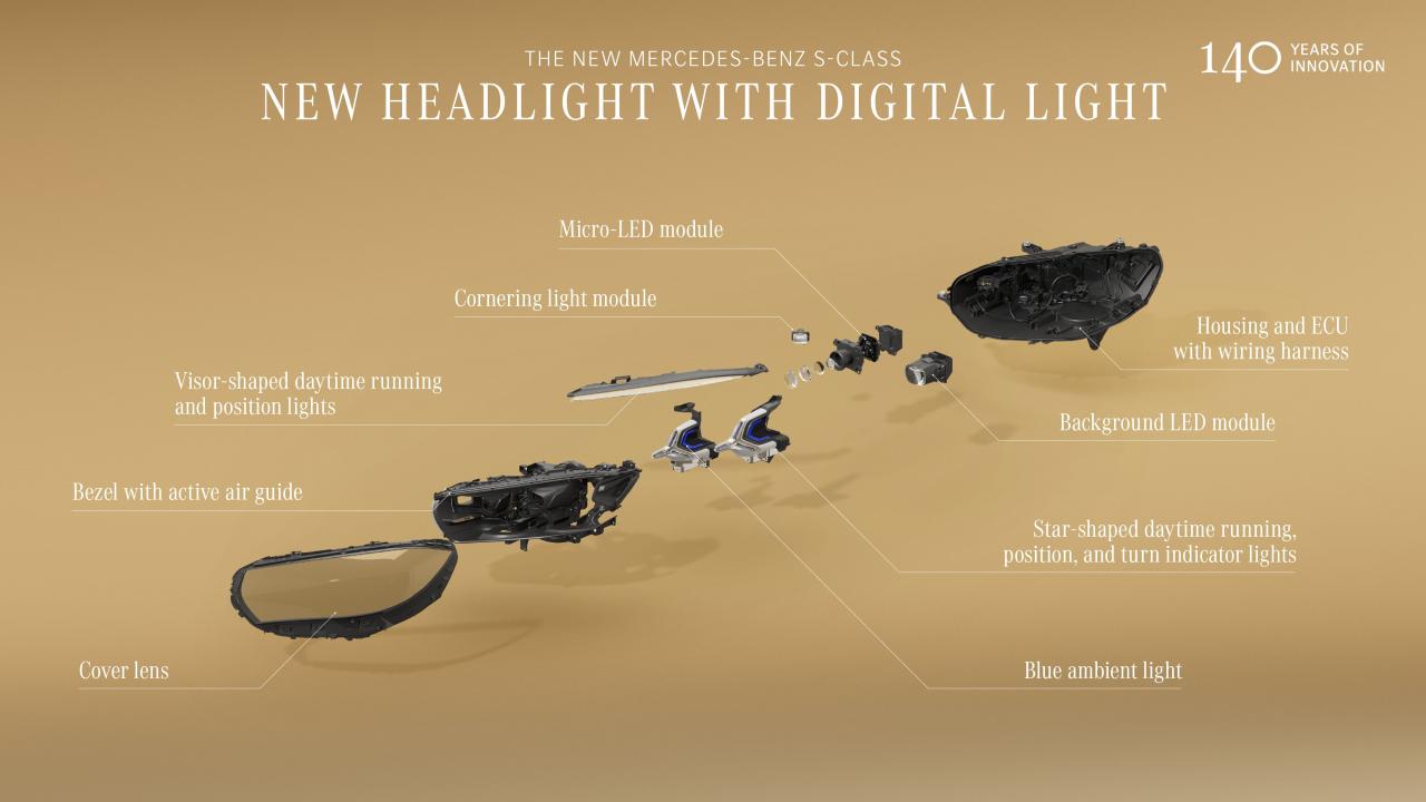 Visuellement, la Classe S adopte une signature plus affirmée. La calandre gagne en largeur et peut désormais être éclairée, tout comme l'étoile dressée sur le capot, proposée pour la première fois en version lumineuse. Les nouveaux projecteurs DIGITAL LIGHT à technologie micro-LED offrent une portée accrue et une meilleure définition du faisceau, tandis que les feux arrière adoptent un graphisme à trois étoiles. L'éclairage devient un élément central de l'identité du modèle, avec également un projecteur latéral diffusant le nom Mercedes-Benz au sol à l'ouverture des portes.