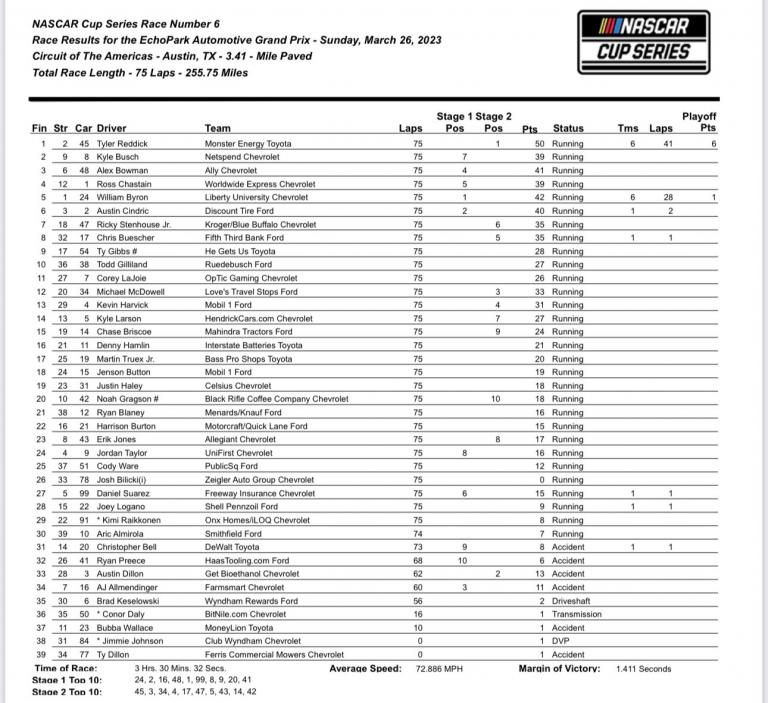 Résultats des anciens pilotes de F1 en NASCAR au COTA : Button P18 et Räikkönen P29.