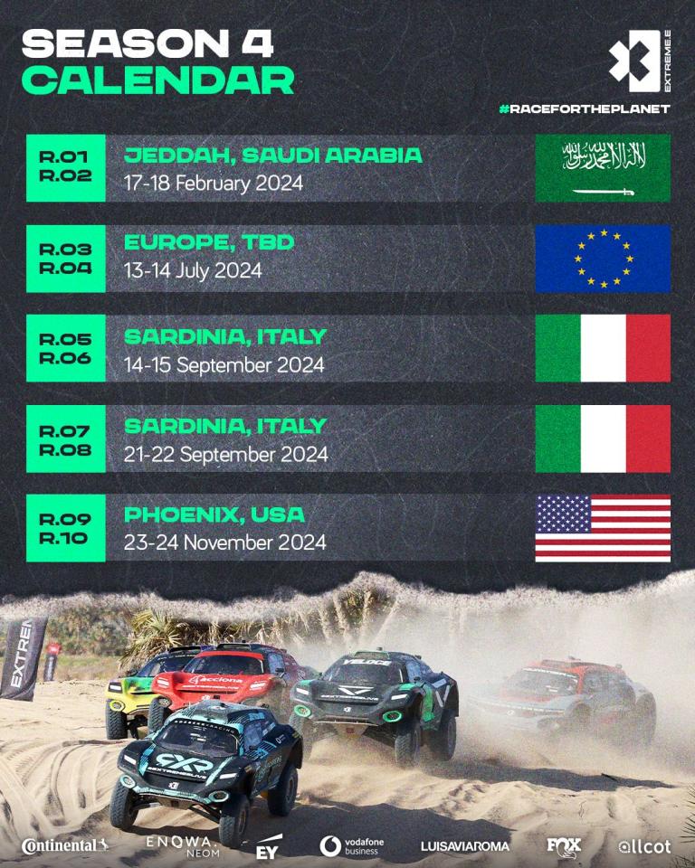 Le calendrier 2024 d'Extreme E, championnat électrique de course tout-terrain, a été dévoilé. La saison débutera en Arabie Saoudite les 17-18 février. Trois courses suivront en Europe, avec les détails des Rounds 3 et 4 annoncés plus tard. La série retournera en Sardaigne en septembre pour les Rounds 5 à 8, un lieu devenu incontournable depuis 2021. En Sardaigne, les voitures Extreme H, fonctionnant à l'hydrogène, seront testées avant leur lancement en 2025. La saison se terminera à Phoenix, Arizona, en novembre, marquant les débuts du championnat aux États-Unis.