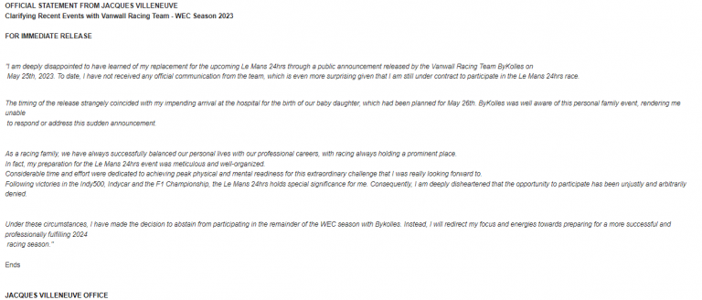 Jacques Villeneuve envoie chier Vanwall, n’ayant appris son replacement que par communiqué.