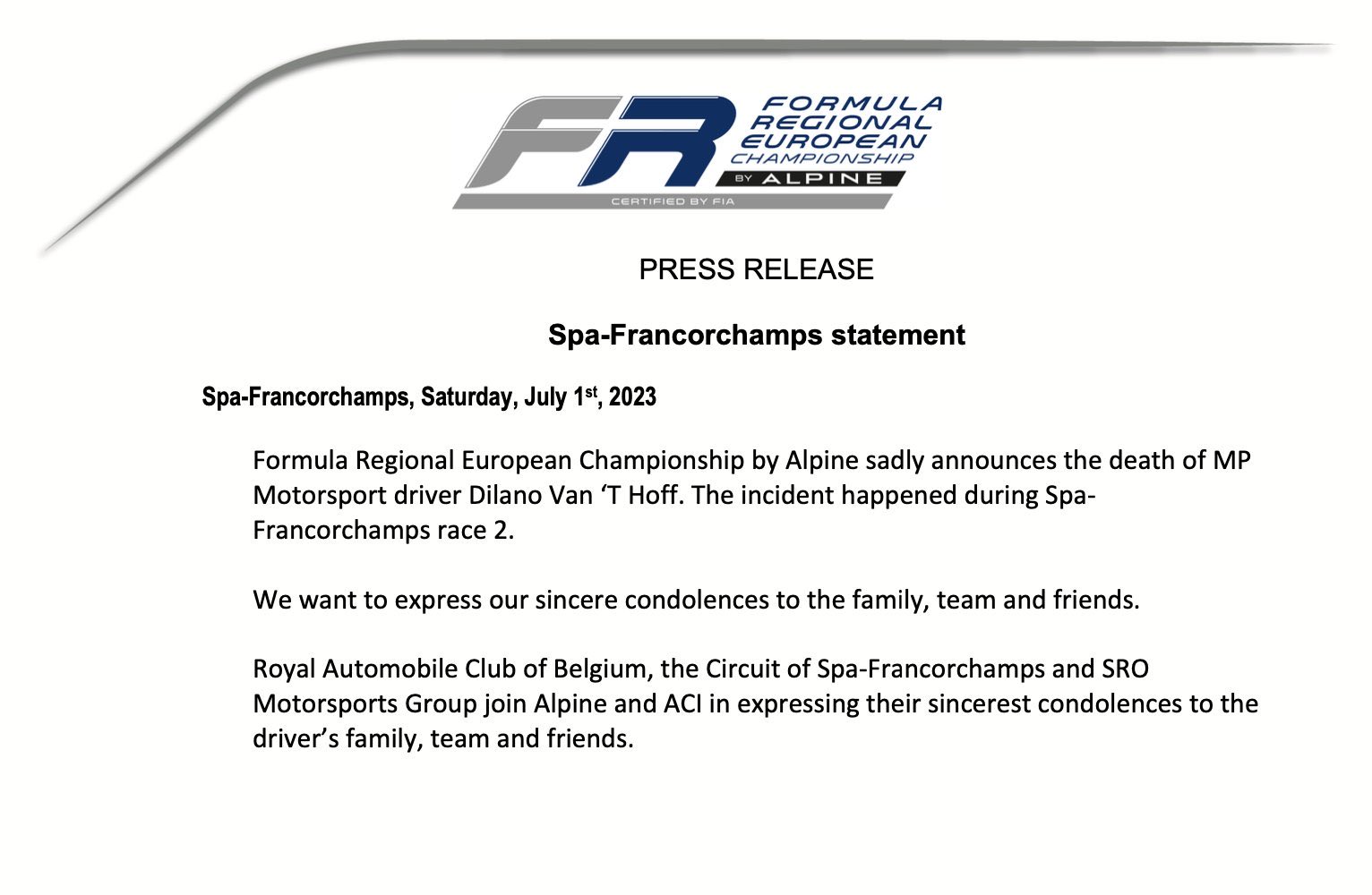 Condoléances à la famille et aux amis de Dilano Van ‘T Hoff, décédé à Spa pendant une course de FRECA.