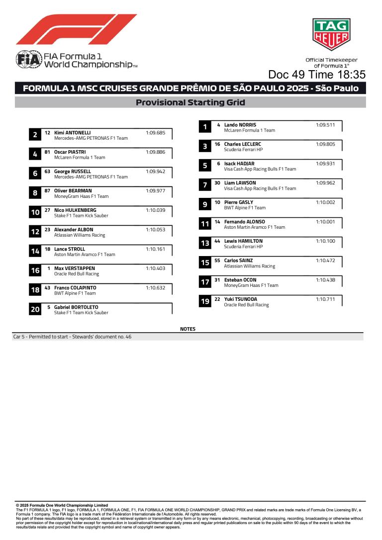 Norris en pole à São Paulo, Antonelli deuxième, Leclerc troisième