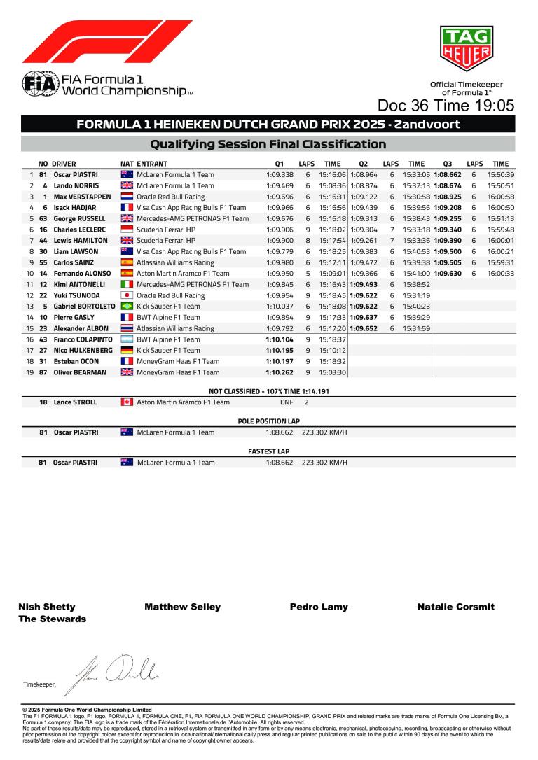 Dès la Q1, Piastri avait donné le ton en s'installant en tête, avant que Norris ne réplique en Q2. La bataille a atteint son paroxysme en Q3 : Piastri a pris la pole provisoire, et malgré une ultime tentative, Norris n'a pas réussi à améliorer son chrono. Derrière les deux McLaren, Max Verstappen a conquis la troisième place, se plaçant en embuscade devant son public, à 0"263 du temps de référence.