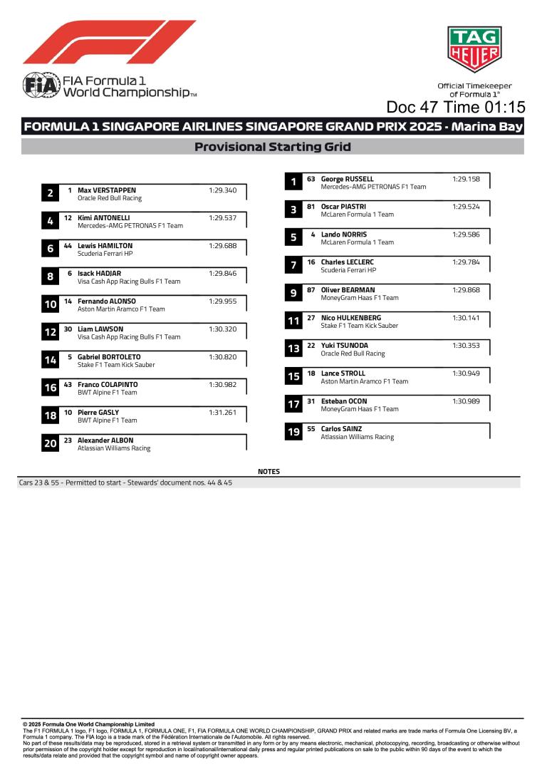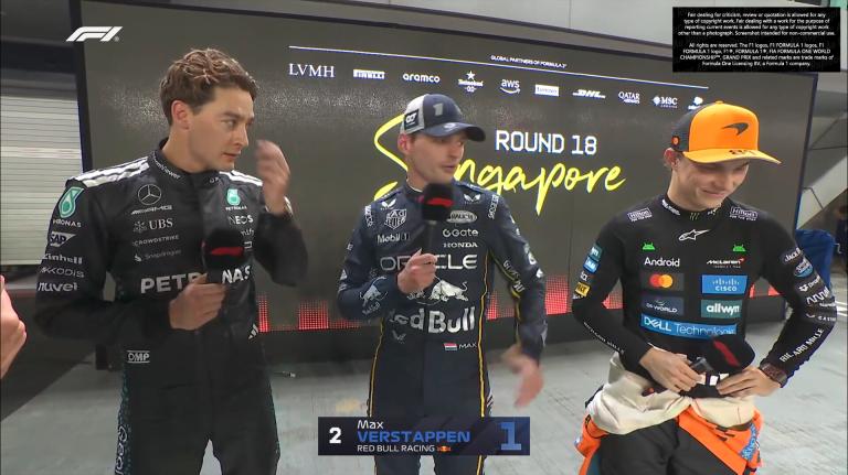 Déjà dominateur en Q2, Russell a confirmé en Q3 en frôlant les murs du circuit urbain de Marina Bay. Ses deux tentatives se sont révélées implacables, la seconde ne lui offrant que sept millièmes de mieux mais suffisants pour s'assurer la première place, sa deuxième pole de la saison après Montréal. Verstappen, frustré par une gêne aérodynamique de Norris, n'a pas trouvé la vitesse suffisante pour aller plus vite, tandis que Piastri a placé McLaren en embuscade.