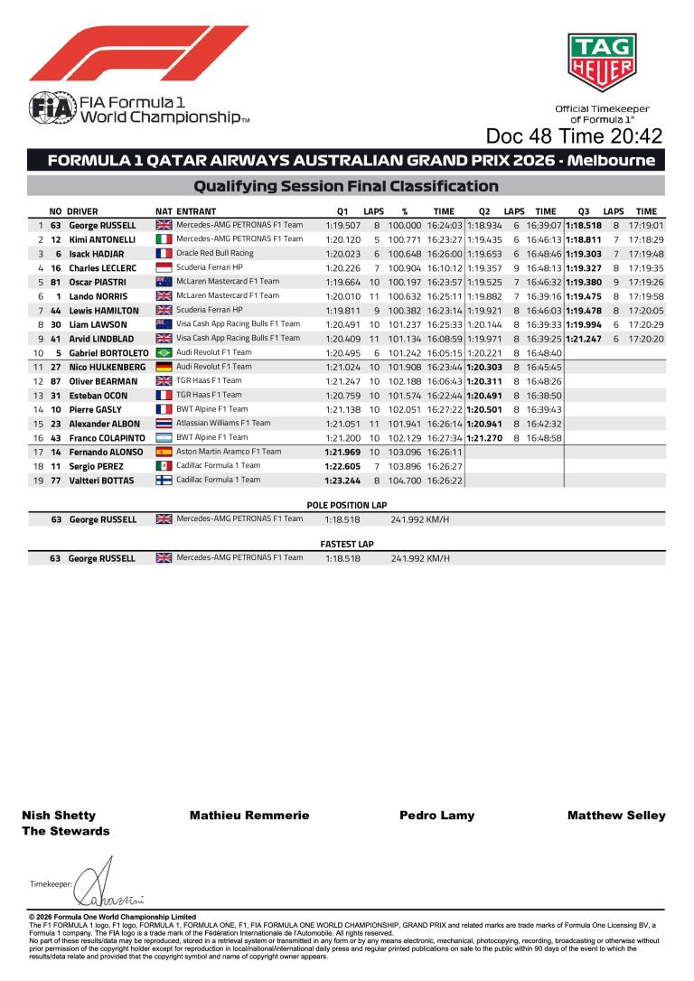 Classement complet de la séance de qualifications du Grand Prix d'Australie 2026.