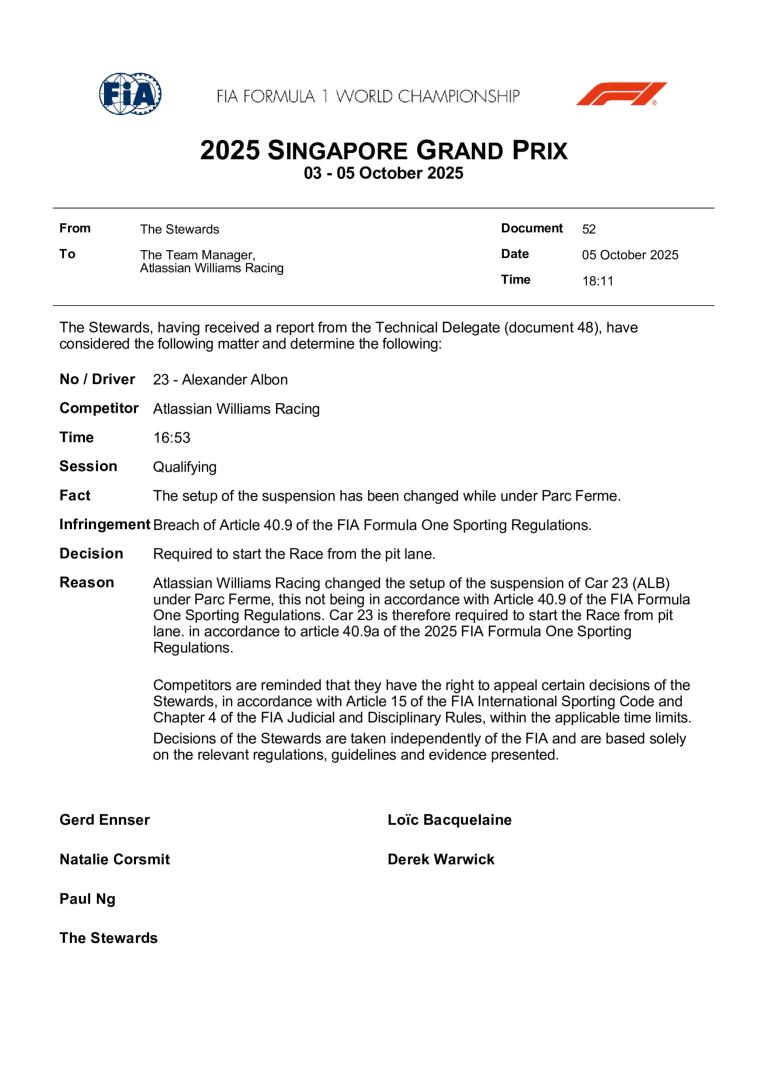 Comme Pierre Gasly, Alexander Albon partira depuis la voie des stands à Singapour. Les commissaires ont constaté une modification des réglages de suspension de sa Williams alors que la voiture était sous régime de parc fermé, en violation…