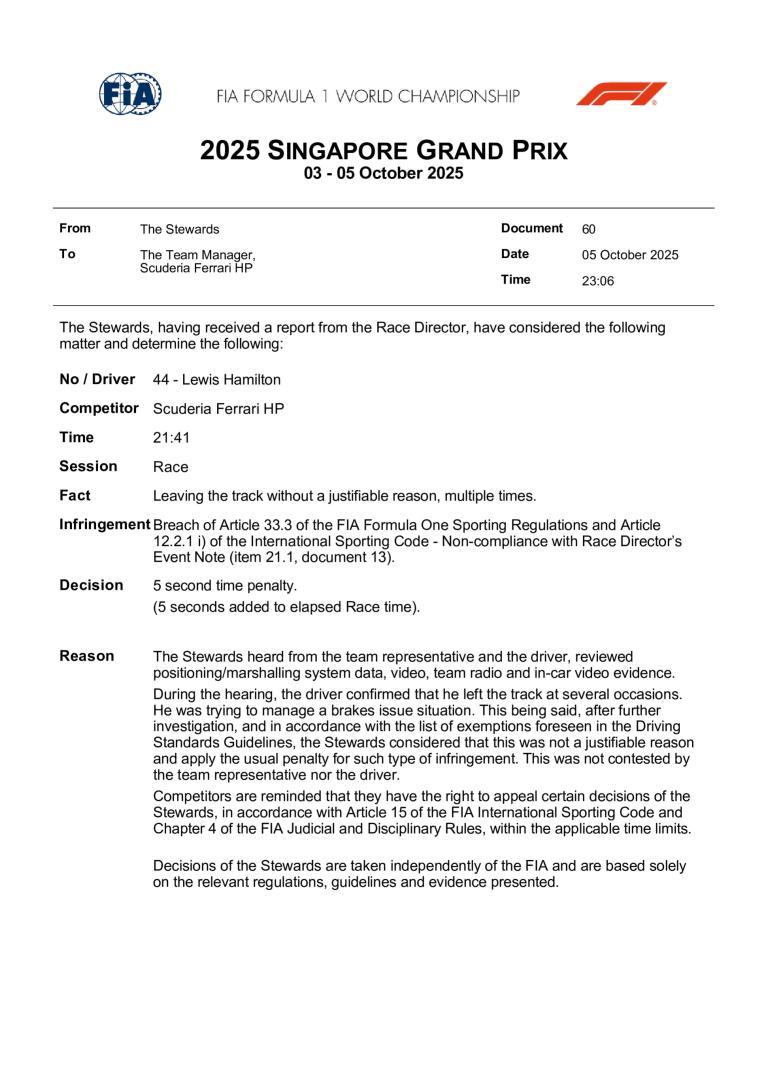 Lewis Hamilton a écopé d'une pénalité de cinq secondes pour avoir dépassé à plusieurs reprises les limites de piste dans les derniers tours du Grand Prix de Singapour, alors qu'il tentait de contenir Fernando Alonso dans la lutte pour la…