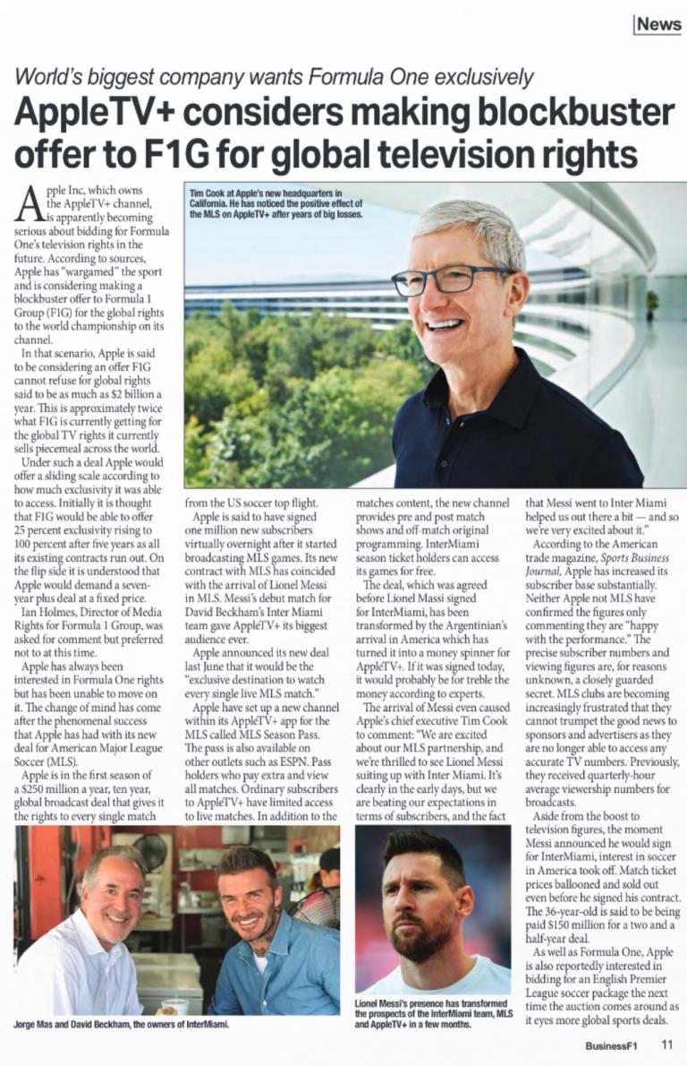"Dans ce scénario, Apple serait en train de considérer une offre que le F1G ne pourrait pas refuser pour des droits mondiaux évalués à environ 2 milliards de dollars par an. C’est environ le double de ce que le F1G obtient actuellement pour les droits de diffusion télévisée mondiale qu’il vend actuellement en détail à travers le monde.