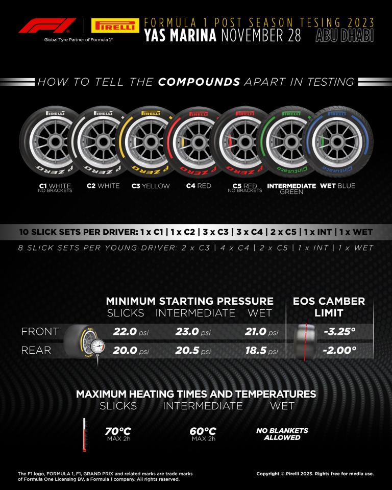 Il a conclu avec la distribution de sets pour chaque voiture : "Ainsi, le test pourrait être utile pour les équipes pour travailler sur la gestion des pneus en collectant des données pour la saison prochaine. Les équipes auront une allocation de pneus prédéterminée pour le test. La voiture effectuant le travail sur les pneus aura 10 ensembles disponibles au test, consistant en un C1, un C2, deux C5, et trois ensembles chacun de C4 et C3. Pendant ce temps, la voiture pour les jeunes pilotes aura deux ensembles chacun de C3 et C5 disponibles ainsi que quatre ensembles de C4."