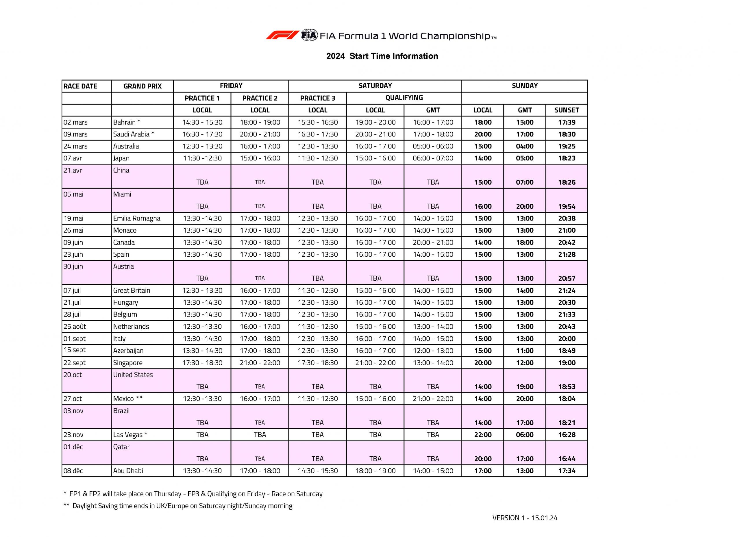 La FIA a annoncé les horaires des Grands Prix de F1 pour 2024.