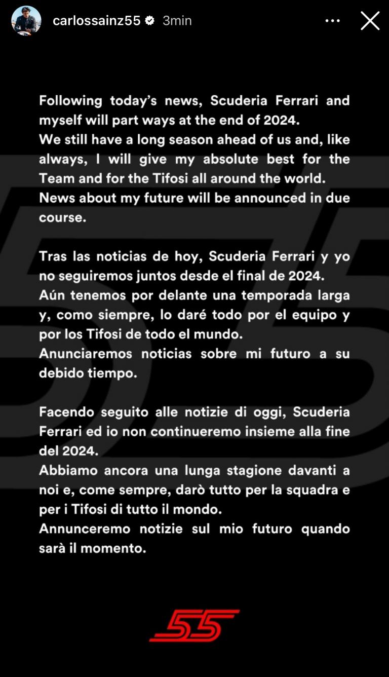 L’actualité sur le futur de Sainz sera annoncée en temps voulu et le pilote espagnol informe que son chemin commun avec Ferrari aura donc un terme fin 2024, suite à l’annonce de l’écurie italienne concernant Hamilton.