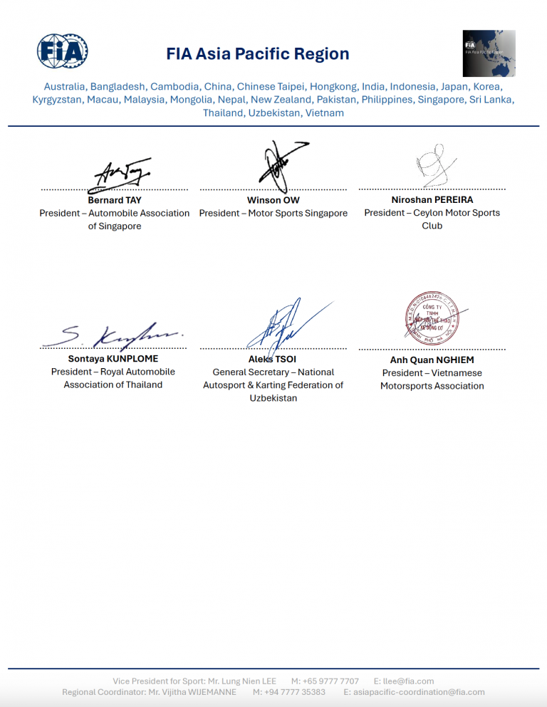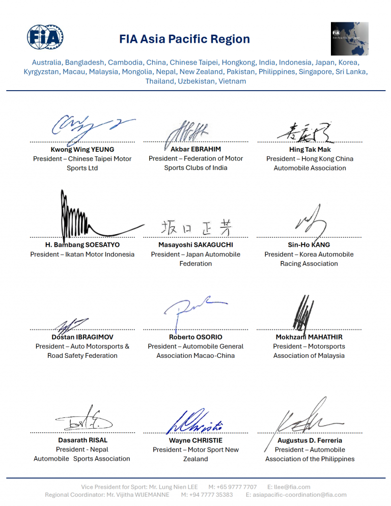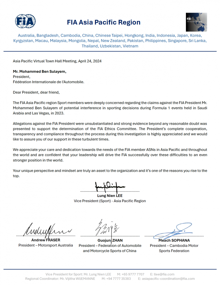 Une lettre de la faction Asie-Pacifique de la FIA, adressée au Président de la Fédération Internationale de l'Automobile, Mohammed Ben Sulayem, datée du 24 avril 2024 a été republiée par la FIA elle-même. Elle exprime le soutien des membres de cette région suite à des allégations non prouvées concernant une éventuelle interférence du président lors des Grands Prix de Formule 1 en Arabie Saoudite et à Las Vegas en 2023. La lettre souligne la coopération du président avec le Comité d'éthique de la FIA et reconnaît sa perspective unique (sa vision) et son leadership comme essentiels pour la FIA.