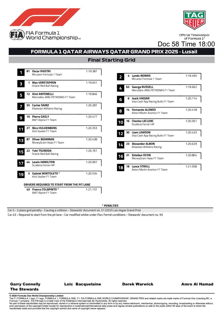 Et voici la grille de départ défintive du Grand prix du Qatar 2025 avce Piastri en pole position devant Norris et Verstappen.