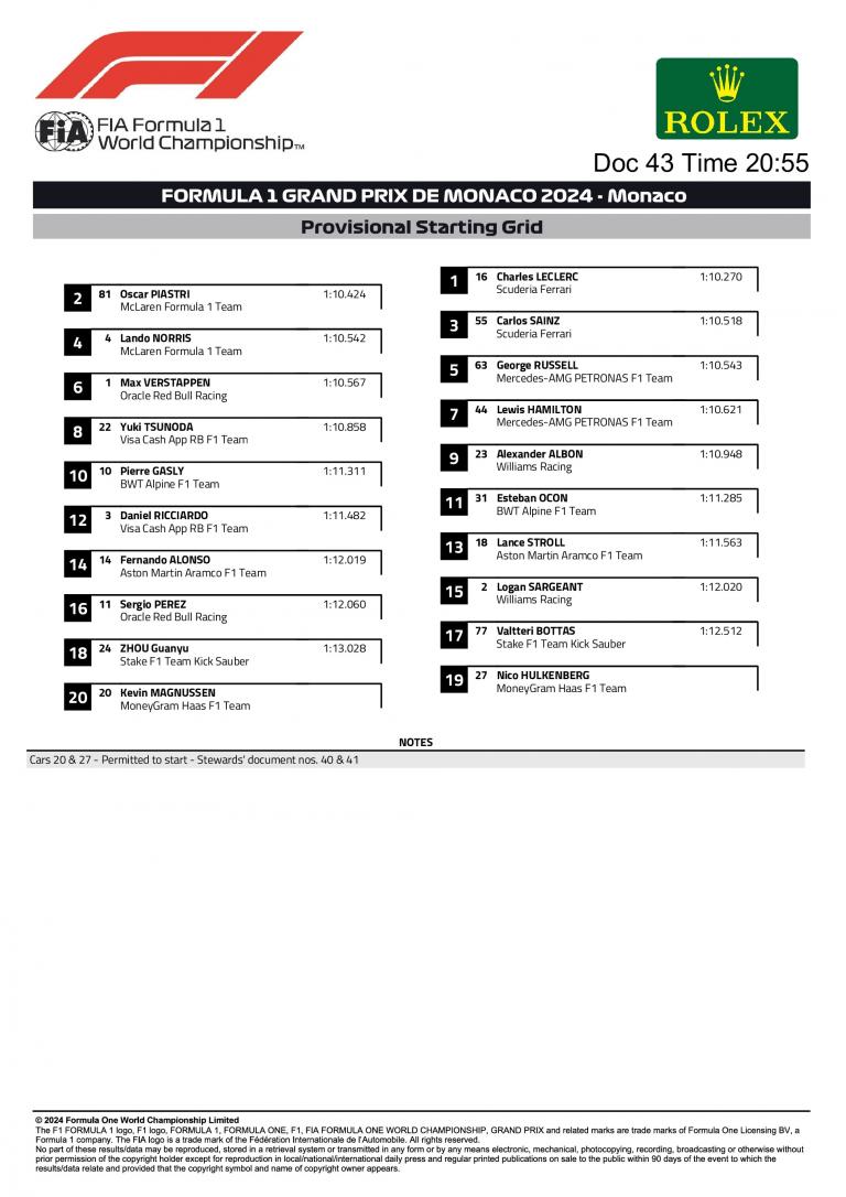 Grille de départ provisoire pour le Grand Prix de Monaco 2024.