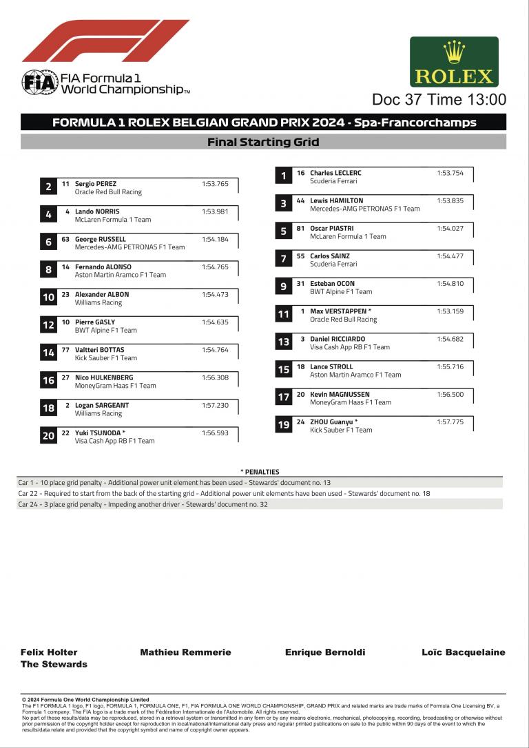 Grand Prix de Belgique 2024 : grille de départ définitive
