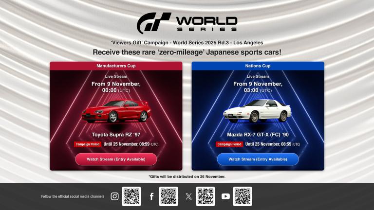 À l’occasion de la manche 3 des Gran Turismo World Series 2025 à Los Angeles, les joueurs peuvent obtenir gratuitement deux légendes japonaises : la Toyota Supra RZ ’97 en Super Red Ⅳ et la Mazda RX-7 GT-X (FC) ’90 en Crystal White.