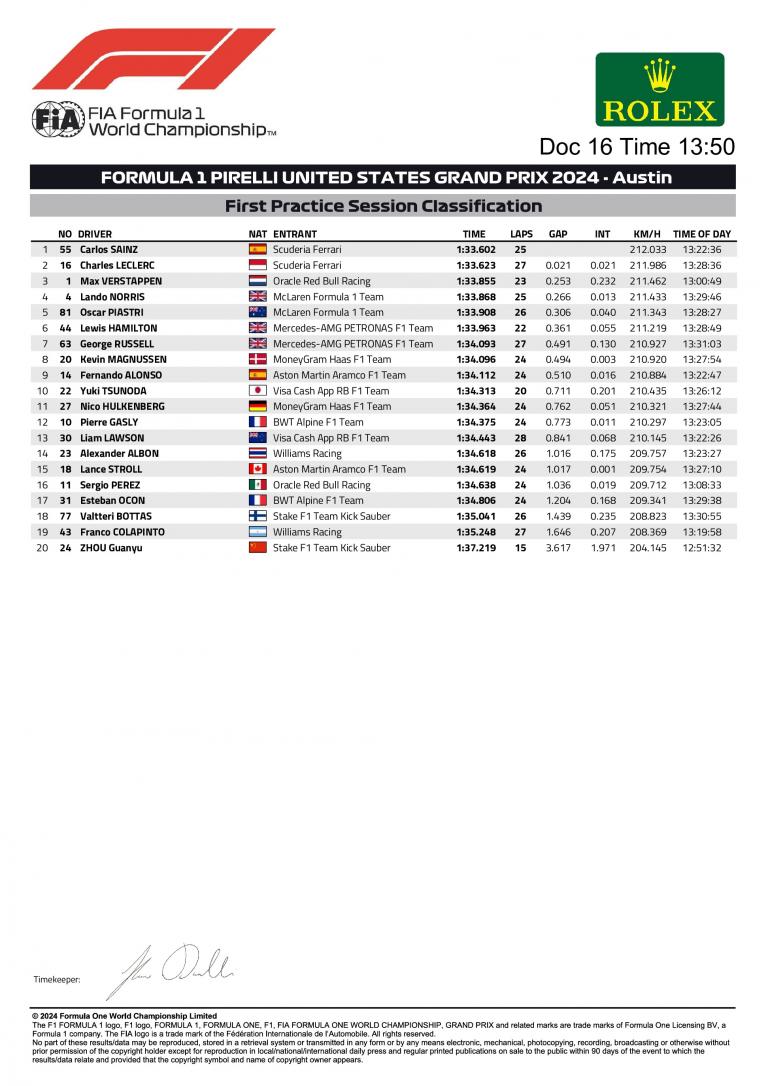 Grand Prix des États-Unis 2024 : résultats de FP1