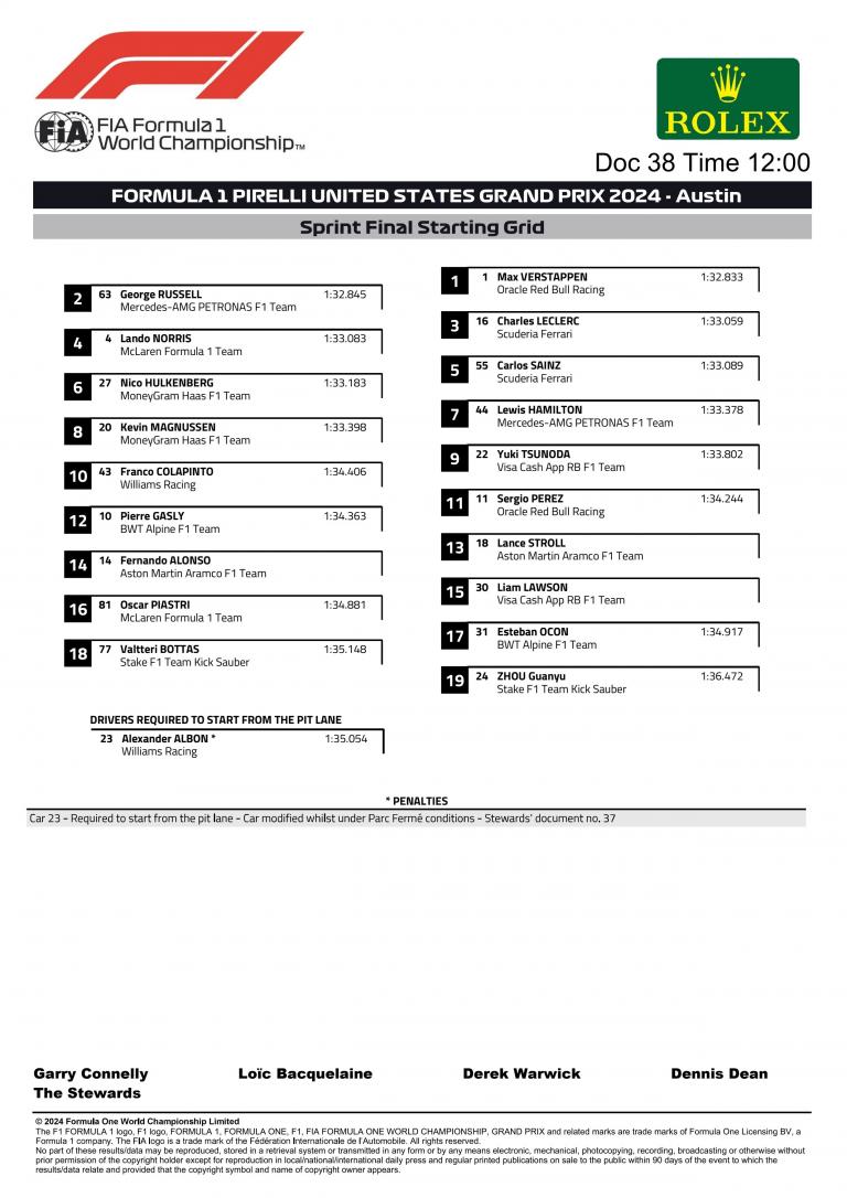 Max Verstappen partira en pole pour le Sprint à Austin après avoir signé un chrono de 1:32.833. Il sera rejoint en première ligne par George Russell, tandis que Charles Leclerc et Lando Norris s’élanceront depuis la deuxième ligne.