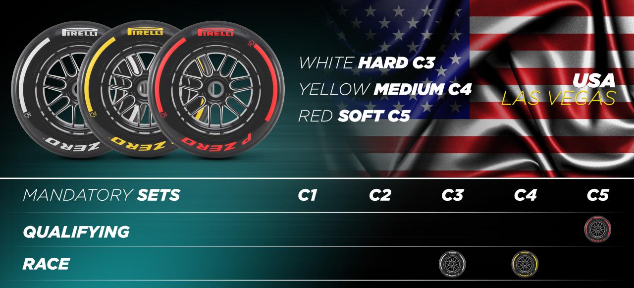 Retour aux Brefs F1Pour la deuxième édition du Grand Prix de Las Vegas, les monoplaces de Formule 1 feront à nouveau face au tracé urbain autour du Strip sous les projecteurs. Comme en 2023, Pirelli a opté pour les trois composés les plus tendres de sa gamme : C3 pour les pneus durs, C4 pour les médiums et C5 pour les tendres.