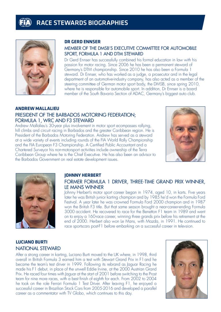 Retour aux Brefs F1Pour ce Grand Prix du Brésil 2024, les commissaires de course choisis par la FIA incarnent une combinaison d'expérience et de diversité culturelle, avec une attention particulière aux spécificités du règlement de la Formule 1 et une implication active dans d'autres disciplines du sport automobile.