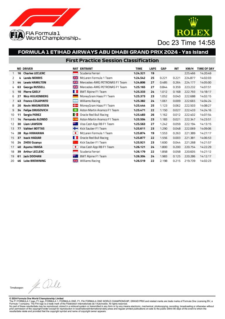 Grand Prix d'Abou Dabi 2024 : résultats de FP1