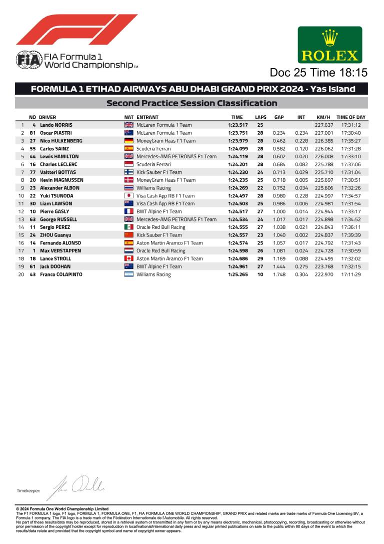 Dans la dernière partie de la séance, les pilotes ont profité de la baisse des températures pour effectuer des simulations de qualifications. Norris a conservé l'avantage devant Piastri, tandis que Sainz a pris la quatrième place, à 0.582s de la référence. Lewis Hamilton, pour son dernier week-end avec Mercedes, a signé le cinquième temps, devant un Leclerc pénalisé.