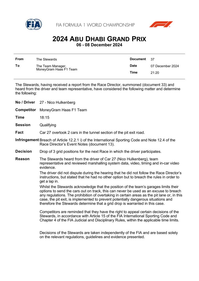 Le pilote Haas a écopé de trois places de pénalité sur la grille du dernier Grand Prix de la saison, après avoir dépassé deux voitures dans la section du tunnel à la sortie des stands lors des qualifications.