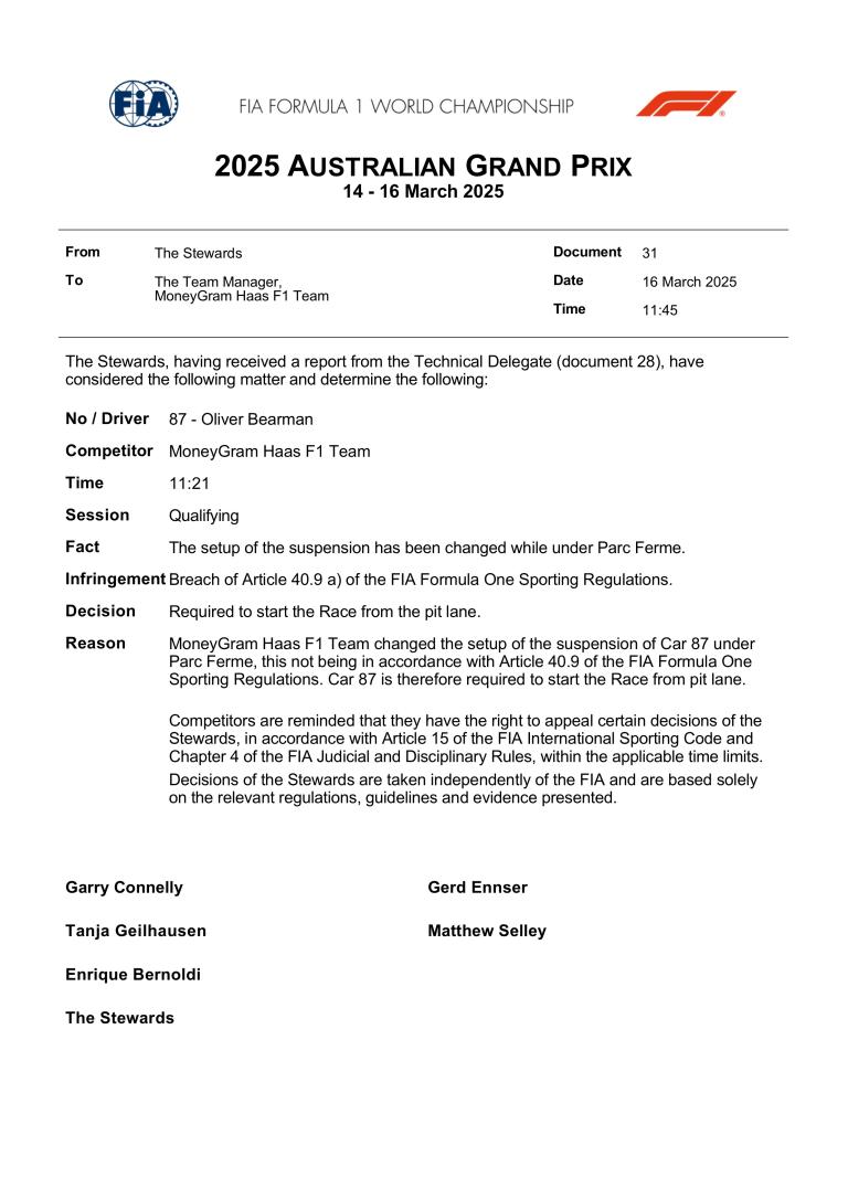 Oliver Bearman partira depuis la voie des stands du Grand Doric d'Australie 225 après une sanction des commissaires : Haas a modifié les suspensions de sa monoplace sous Parc Fermé, en infraction avec l'Article 40.9 du règlement sportif.