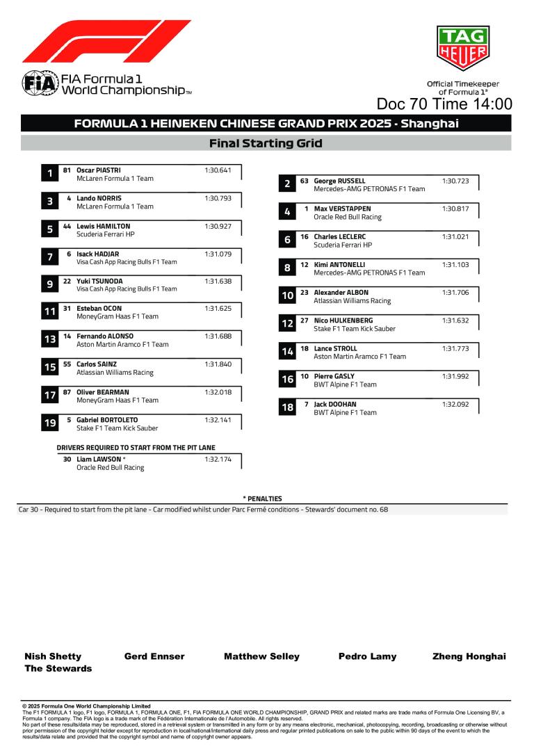 La FIA a publié la grille de départ définitive du Grand Prix de Chine 2025. Sous régime de parc fermé, Red Bull en a profité pour toucher aux réglages de suspension de Lawson qui démarrera de la voie des stands.