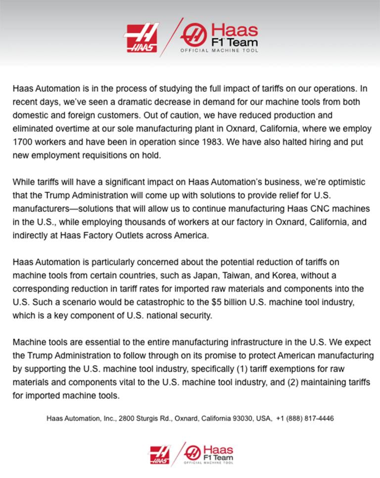 Haas Automation Statement Regarding Tariffs pic.twitter.com/8Q9BuSOHHf