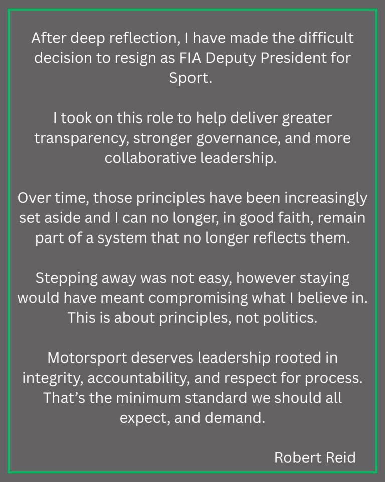 Dans son message, Robert Reid conclut sur une exigence de fond : "Le sport automobile mérite un leadership fondé sur l'intégrité, la responsabilité et le respect des procédures. C'est le standard minimum que nous devrions tous attendre — et exiger."