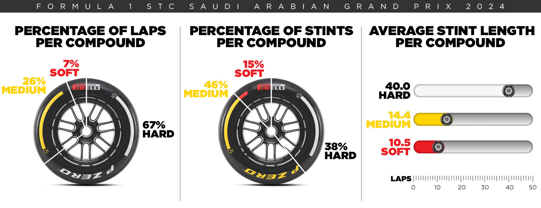 Pour cette édition, Pirelli modifie sa stratégie en choisissant un cran plus tendre que les années passées : les C3, C4 et C5 sont ainsi désignés respectivement comme dur/hard, médium et tendre/soft. Ce choix s'inscrit dans la volonté conjointe du manufacturier, de la FIA et des écuries d'ouvrir la porte à davantage de stratégies, dans l'espoir de rendre les courses moins prévisibles. Jusqu'à présent, le Grand Prix d'Arabie Saoudite s'est toujours résumé à un arrêt unique, même lorsque la voiture de sécurité redistribuait brièvement les cartes. En 2024, seul Bottas avait tenté deux arrêts ; tous les autres avaient opté pour un relais initial en médium (C3) suivi d'un passage en dur (C2). Seuls Bearman (Ferrari) et Bottas (Sauber) avaient osé débuter en tendre (C4), tandis que Norris, Hamilton et Zhou avaient prolongé leur relais en médium avant de conclure sur la gomme tendre, prouvant qu'elle pouvait aussi tenir la distance.