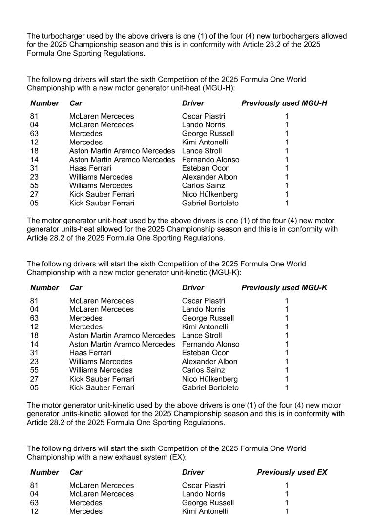 Chez McLaren, Oscar Piastri et Lando Norris entament ainsi le week-end avec un ensemble complet neuf. Même scénario chez Mercedes, tant pour George Russell que pour le rookie Andrea Kimi Antonelli. Aston Martin fait de même avec ses deux pilotes, Fernando Alonso et Lance Stroll, tout comme Williams avec Alexander Albon et Carlos Sainz. Haas engage également un nouveau groupe propulseur pour Esteban Ocon, de même que Sauber pour Nico Hülkenberg et Gabriel Bortoleto.