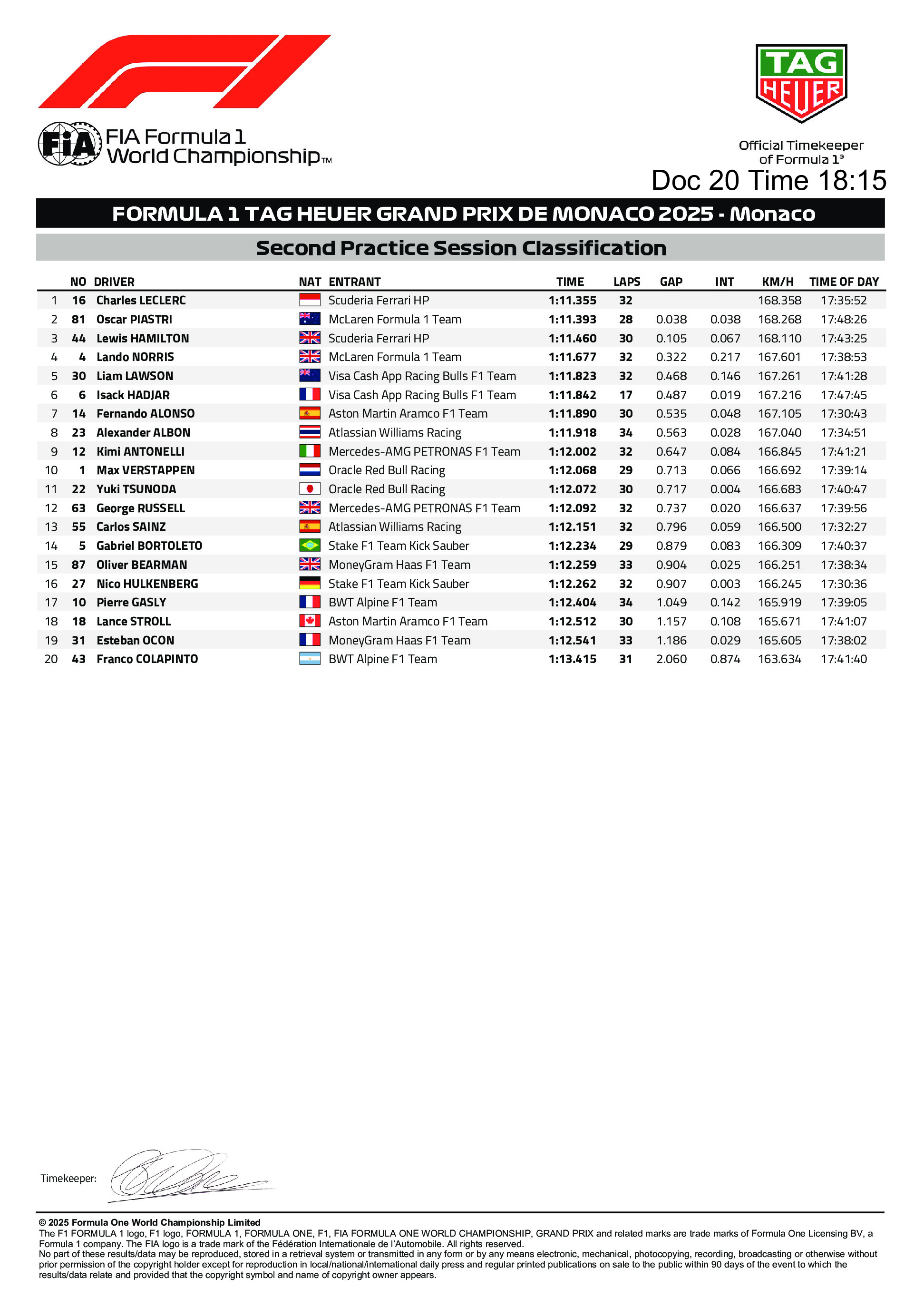 Parmi les faits marquants de la fin de séance : Bearman, 15e, s'est vu infliger une pénalité de dix places sur la grille pour avoir dépassé sous régime de drapeau rouge – une erreur coûteuse. Stroll, pénalisé d'une place pour l'incident avec Leclerc en FP1, ne fait pas mieux que 18e, juste devant Esteban Ocon. Franco Colapinto ferme la marche pour Alpine.