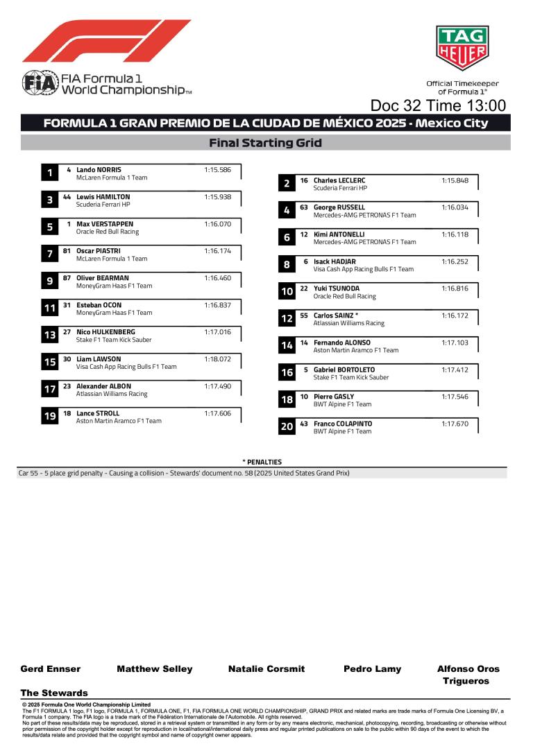 La FIA a publié le document définitif figeant la grille de départ du Grand Prix du Mexique 2025.