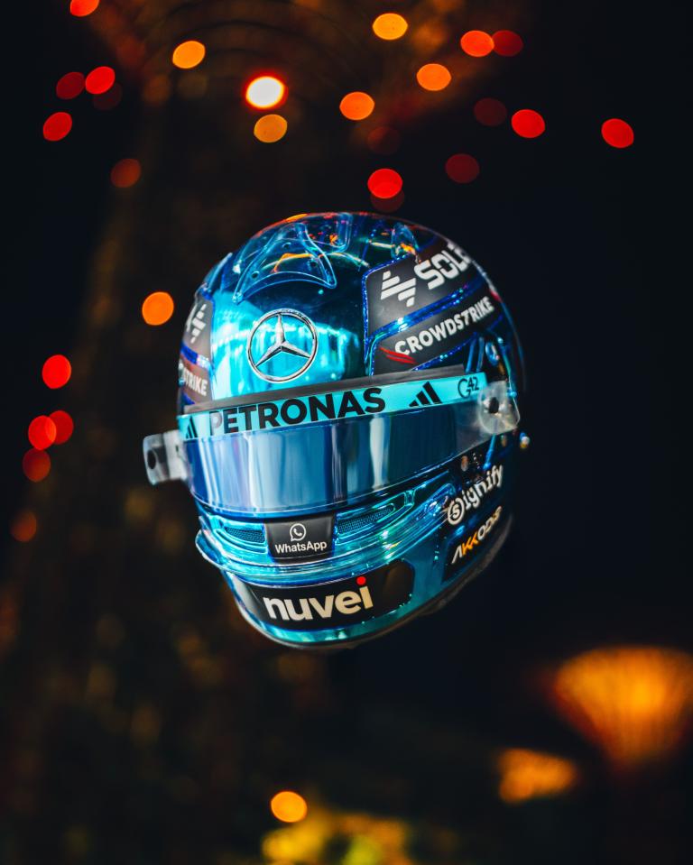 Le Britannique George Russell a choisi un design bleu chromé pour son casque spécial Singapour, parfaitement en phase avec l'ambiance lumineuse du tracé urbain disputé de nuit.