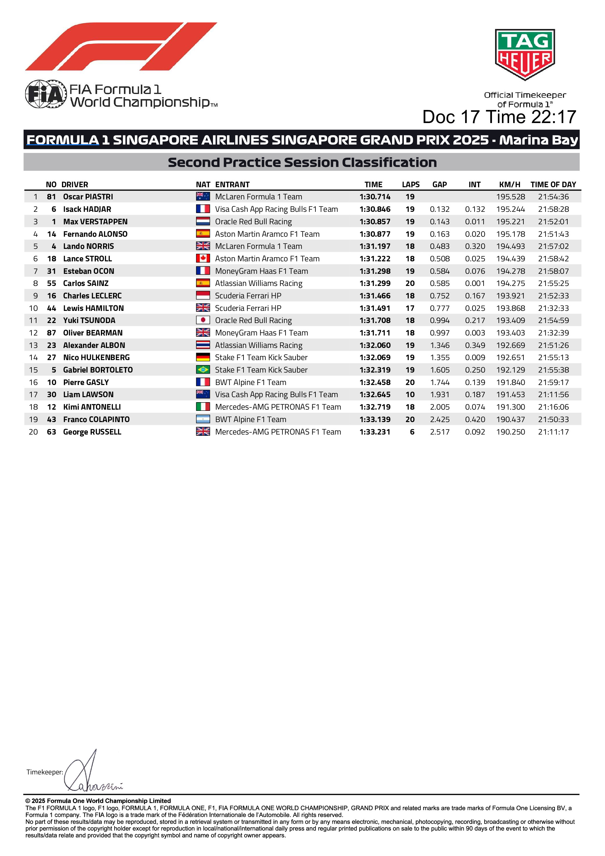 Dans le sprint final, Piastri a trouvé l'ouverture avec un tour en 1:30.714, suffisant pour devancer Isack Hadjar, impressionnant deuxième à 0''132, et Max Verstappen, troisième à 0''143. Alonso s'est classé quatrième, confirmant la bonne forme d'Aston Martin, son coéquipier Lance Stroll prenant la sixième place derrière Norris. Ocon a poursuivi son bon travail avec le septième temps, devant Sainz, Leclerc et Hamilton qui complètent le top 10.