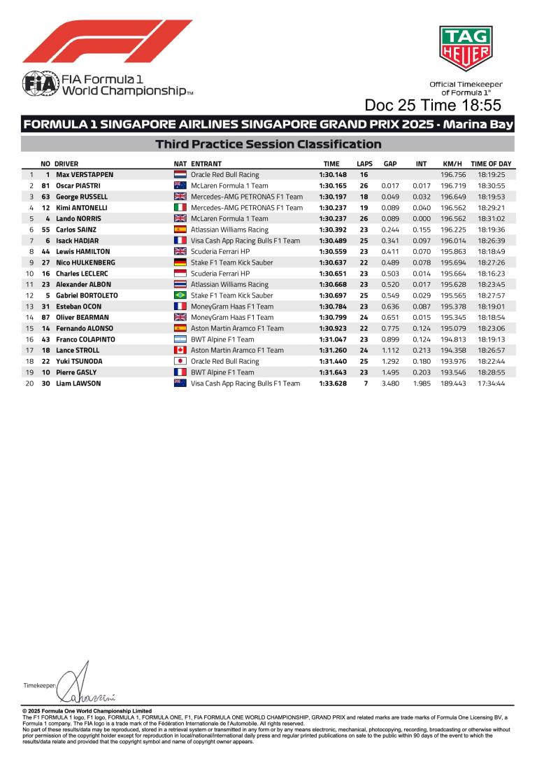 Grand Prix de Singapour 2025 : résultats de FP3