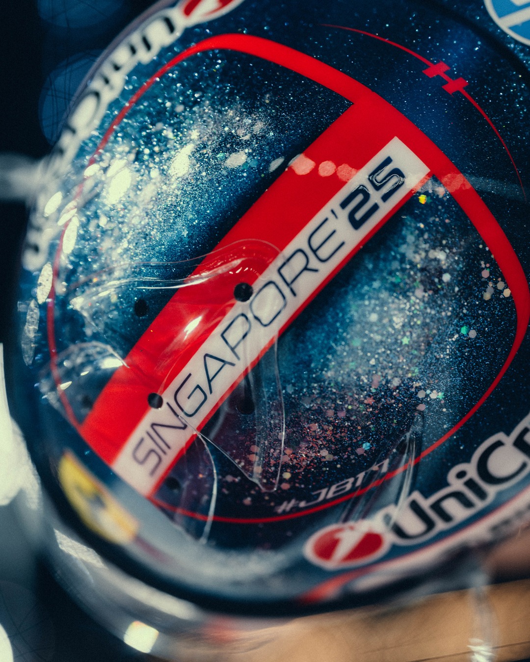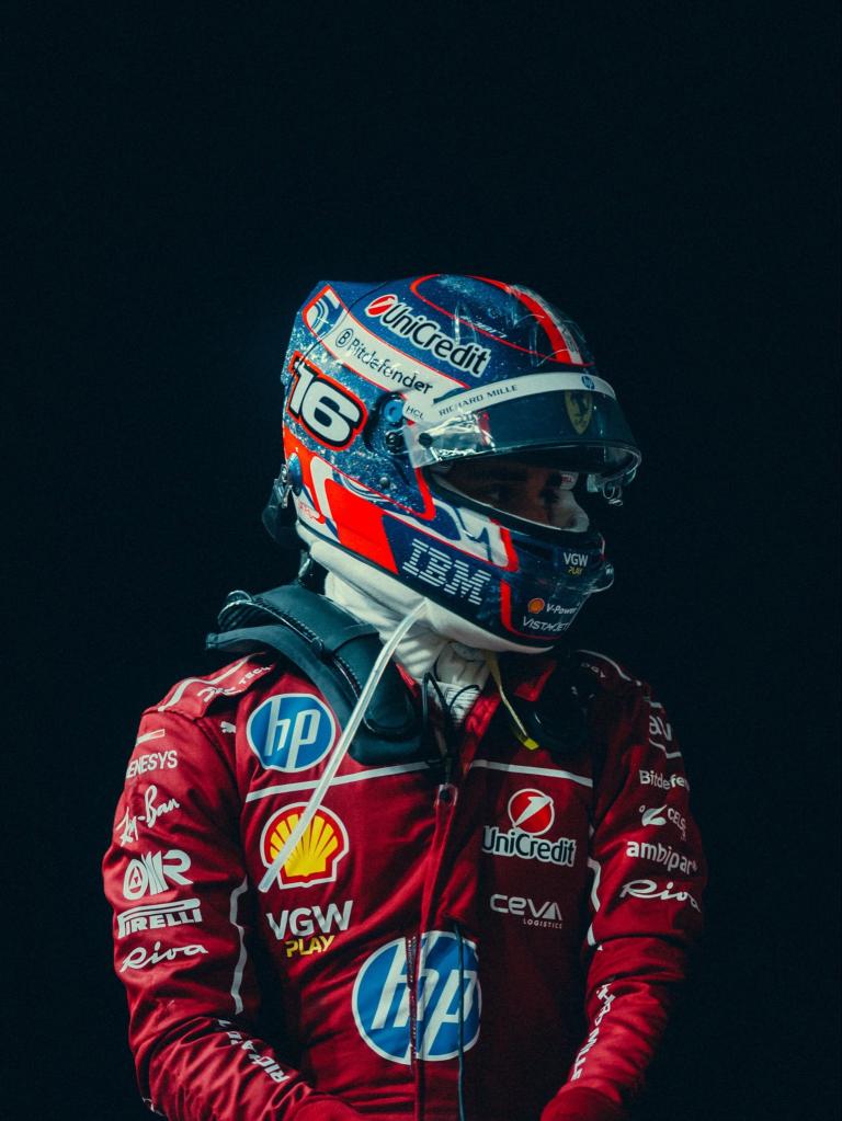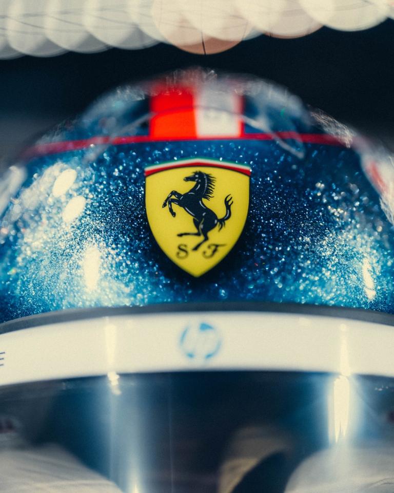 Charles Leclerc a un casque particulier pour le Grand Prix de Singapour 2025. Le Monégasque a choisi une variation pailletée de son design habituel, où dominent le bleu profond et le rouge, complétés par une finition pailletée qui capte les lumières de Marina Bay.