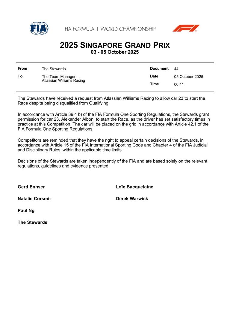 Coup dur pour l'écurie Williams à l'issue des qualifications du Grand Prix de Singapour 2025. Les monoplaces de Carlos Sainz et Alexander Albon ont toutes deux été disqualifiées après que leur aileron arrière a été jugé non conforme au règlement technique de la FIA.