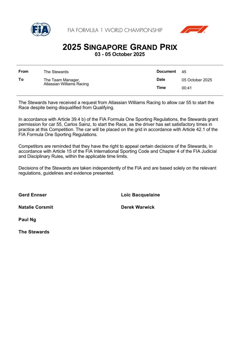 Si Sainz et Albon ont perdu leurs temps en qualifications, ils ont toutefois été autorisés par les commissaires à prendre le départ de la course depuis le fond de grille, après demande de leur équipe et en vertu de l'Article 39.4 b) du Règlement Sportif de la Formule 1.