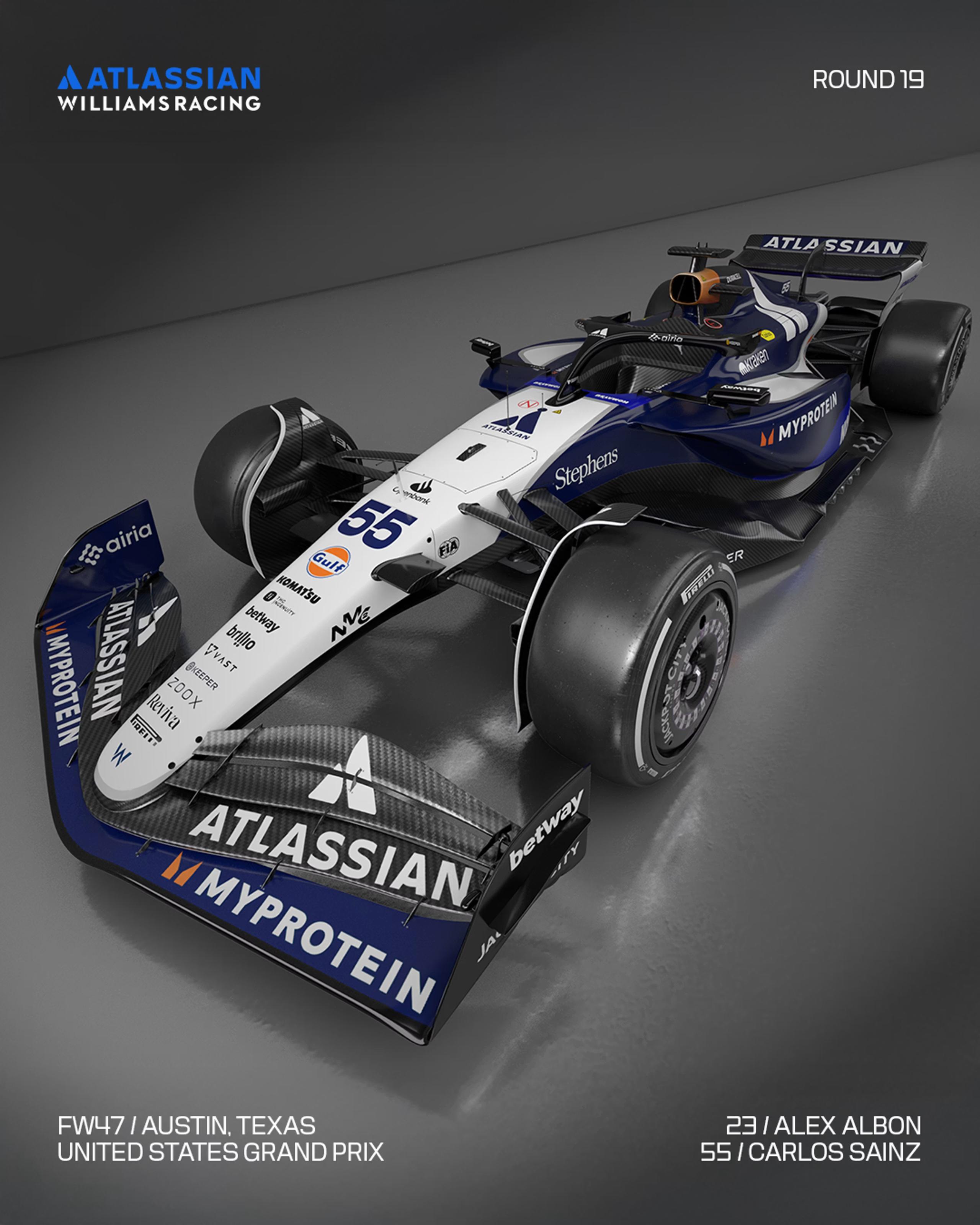 Williams revient à Austin avec une livrée "throwback" pour la FW47, directement inspirée de la FW24 de 2002. Présenté au Lone Star Ranch, le design reprend le duo bleu et blanc qui avait accompagné l'équipe lors de sa dernière grande période face à Ferrari. Le dévoilement a réuni Carlos Sainz, Mike Cannon-Brookes (Atlassian) et Juan Pablo Montoya, figure emblématique de cette saison 2002.