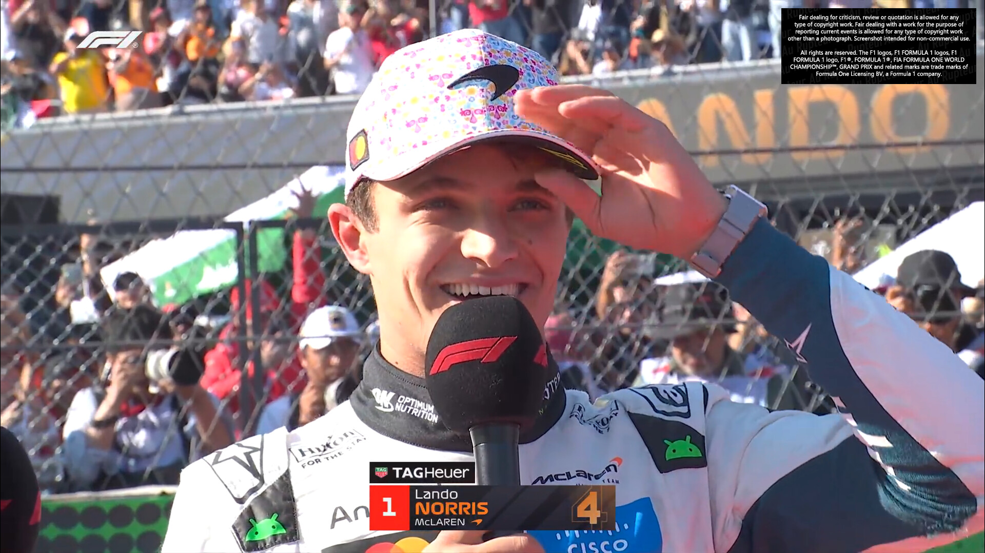 Au micro de la F1, Norris a ensuite résumé sa course avec le même ton posé : "J'adore ça. Quelle course. J'ai simplement gardé les yeux devant, concentré sur ce que j'avais à faire. Une course assez simple pour moi, exactement ce que je voulais. Bon départ, bon envol, bon premier tour et tout s'est enchaîné. J'ai eu un bien meilleur départ que ceux autour de moi. C'est ma première victoire au Mexique, et elle est magnifique."