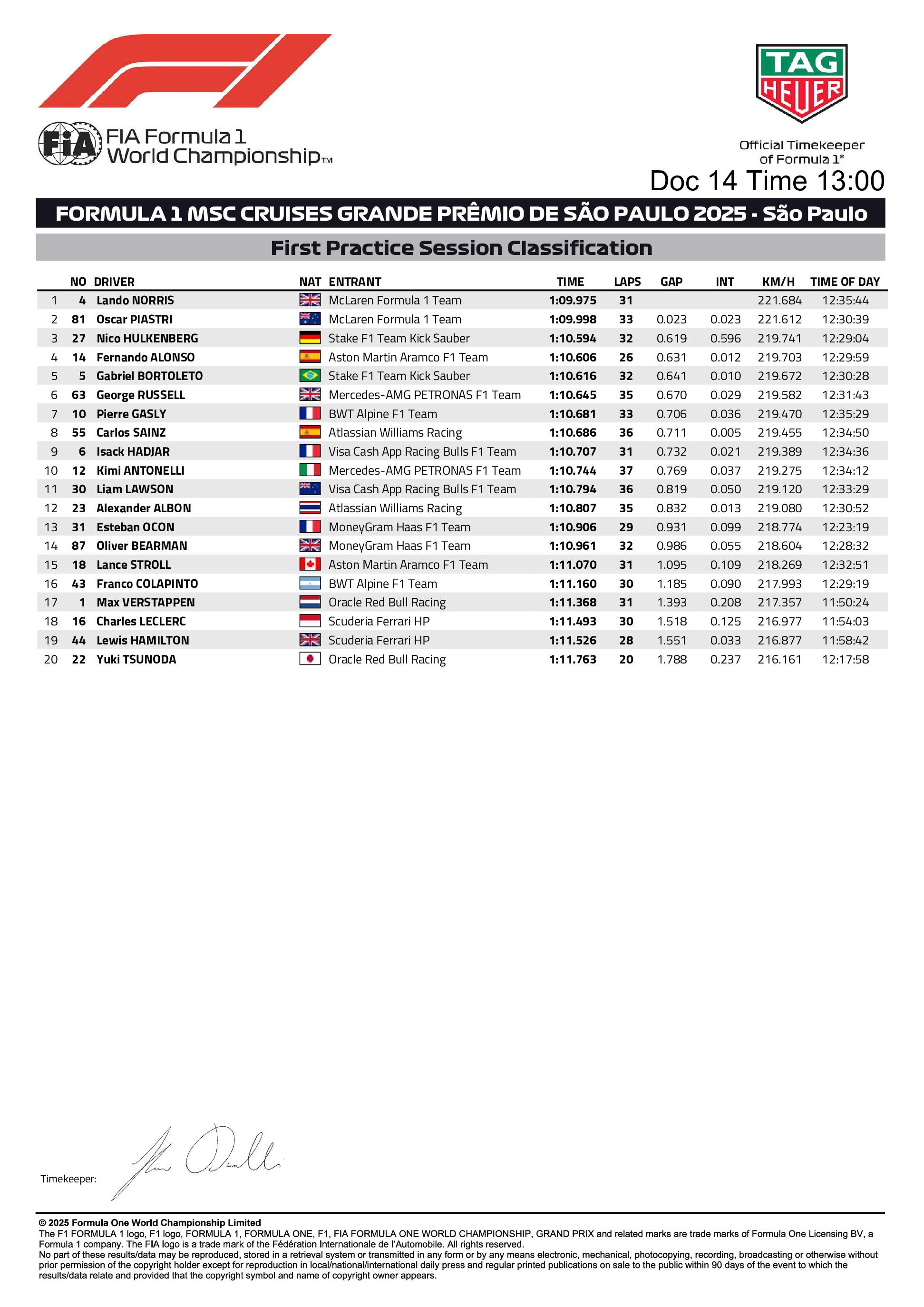 La séance avait pourtant débuté de manière plus classique, avec l'ensemble du plateau lancé en pneus durs pour un premier tour d'installation et de prise de repères. George Russell s'était alors placé en tête de la feuille des temps en 1:11.188, devant Max Verstappen, Carlos Sainz et les deux Ferrari, avant que le travail sur les composés plus tendres ne redistribue les cartes. Sur un tracé court, sinueux et étroit comme l'Autódromo José Carlos Pace, le trafic a immédiatement été un facteur, plusieurs pilotes, dont Antonelli, Hadjar, Russell et Norris, se plaignant de se retrouver gênés dans leurs tours rapides.