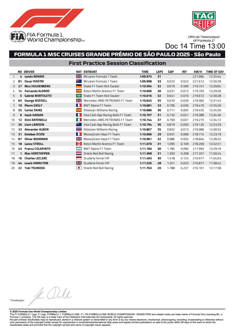 Liam Lawson termine 11e pour Racing Bulls, devant Alex Albon 12e sur l'autre Williams. Le duo Haas se tient en moins d'un dixième, Esteban Ocon en 13e position à 0,931s et Oliver Bearman 14e à 0,986s, après une séance dense en roulage (29 et 32 tours respectivement). Lance Stroll place la deuxième Aston Martin au 15e rang, à 1,095s, devant Franco Colapinto, 16e pour Alpine à 1,185s, qui découvre Interlagos dans le cadre de sa première saison complète en F1.